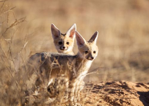 Cape Fox cubs come up from the borrow to play in the sun in the Kgalagadi, South Africa © AdobeStock